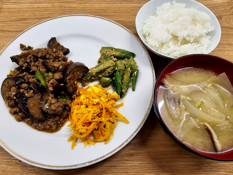 メニューは、麻婆なす、にんじんしりしり、おくらのごま和え、玉ねぎと干ししいたけと薄あげの味噌汁、ご飯でした。