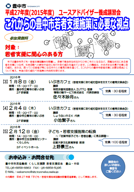 お申込みは、豊中市市民協働部くらし支援課若者支援担当までお願いします。TEL:06-6858-6863 FAX:06-6858-5095