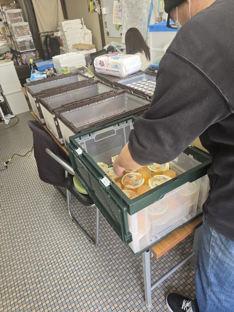 作業をしました。大阪府からの支援の食品です。ひとり親家庭やお困りの家庭にお渡しします。ゼリー、パスタソース、缶詰などを、それぞれの箱に入れました。封筒へのハンコ押しもしました。