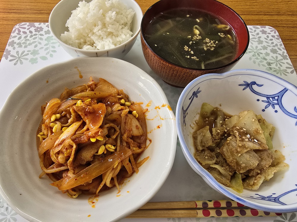 キャベツのごま和えとワカメスープも作りました。参加者は、韓国料理は辛いから敬遠していたが、意外と辛くないことがわかったと言っていました。野菜たっぷりでおいしかったです。