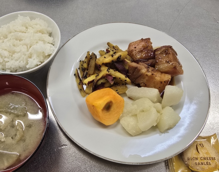 メニューは、スペアリブ、大根のグラッセ、さつま芋のきんぴら、ヤーコンと薄あげの味噌汁、ご飯、デザートの柿とクッキーもありました。