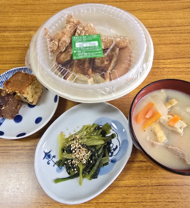 餃子の王将から子ども弁当とカルピスウオーターをいただきました。ありがとうございました。ぐーてんで作った粕汁と小松菜のごま和えもありました。デザートにはパウンドケーキもありました。