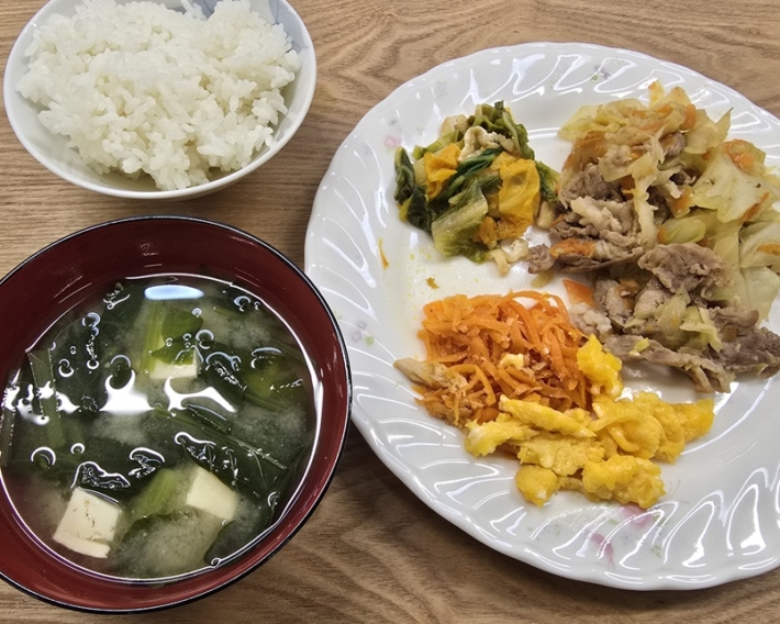 メニューは、豚バラ肉とキャベツのオイスター重ね蒸し、にんじんしりしり、白菜の煮びたし、小松菜と豆腐の味噌汁でした。