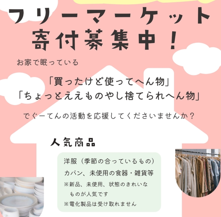 3月13、14日にフリマを開催します。おうちで眠っているけど、まだ使えるものを募集しています。春夏ものの洋服、きれいな食器、雑貨などがありましたら、ご寄付お願いします。